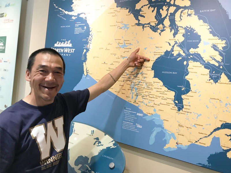 (Photo: Rene Aggrak, the winner of the Indigenous Language Challenge, points out his home community to employees of the North West Company in Winnipeg)