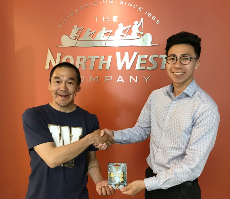 [Photo: North West Company employee Dominic Lee (right) presents the Indigenous Language Challenge prize to Rene Aggrak]